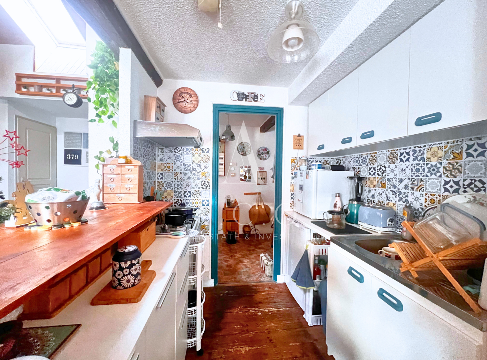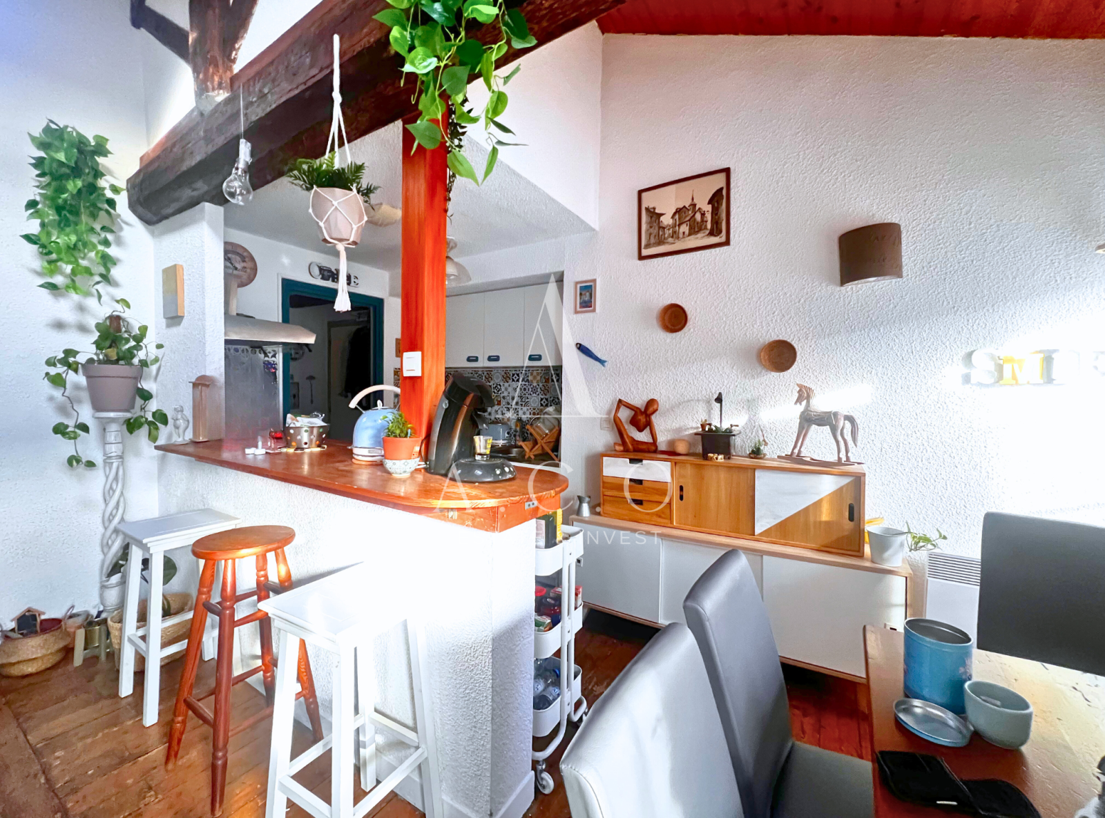 L'appartement se distingue par son espace de vie ouvert de 21m², où la cuisine s'intègre parfaitement au séjour, créant un environnement convivial et lumineux, idéal pour les moments de partage. Le plafond haut et les poutres apparentes apportent un caractère atypique et une touche d'authenticité qui donne du cachet à l'ensemble.